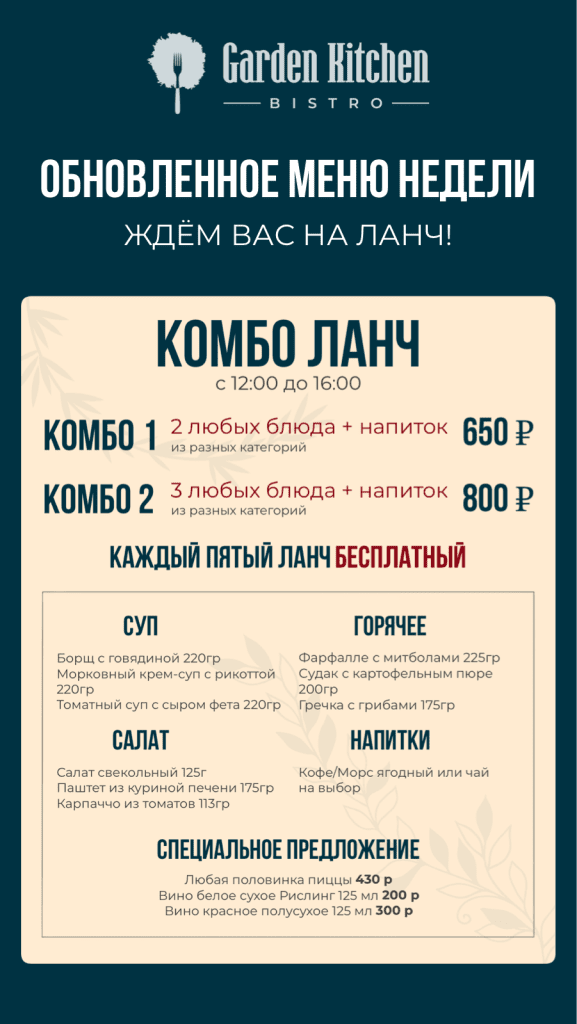 Приглашаем вас на бизнес-ланч в кафе Garden Kitchen Bistro!