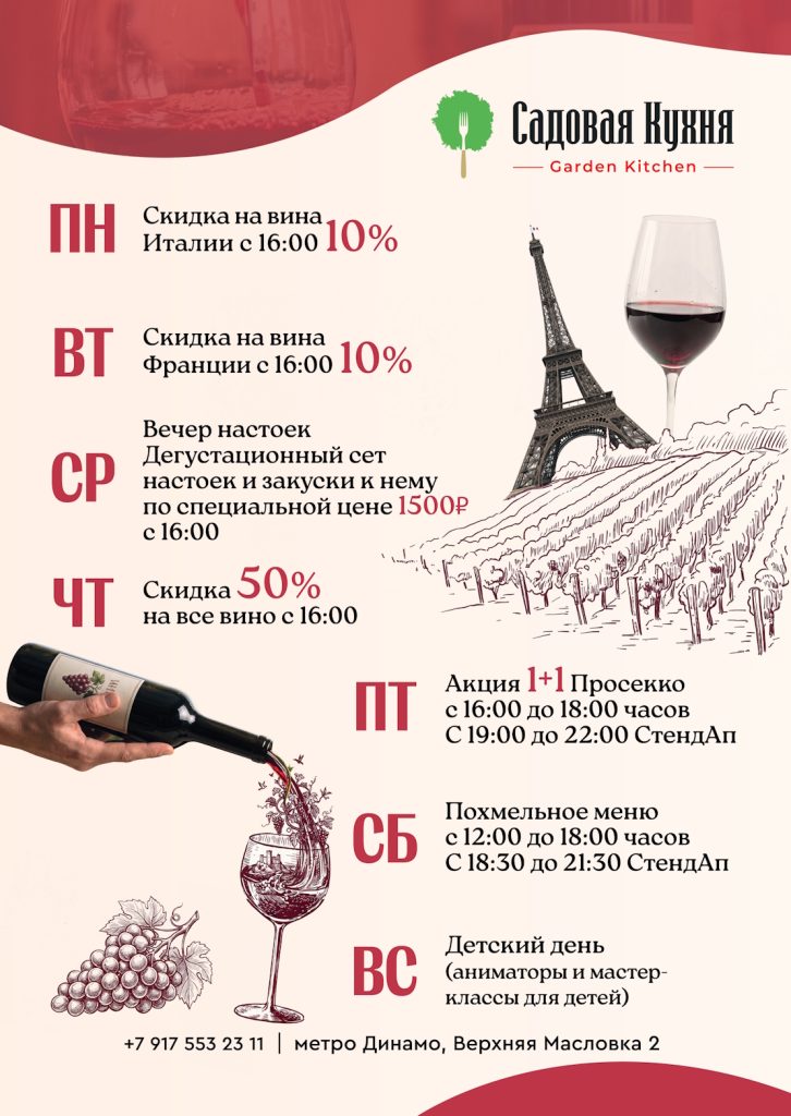 • Четверг: с 16:00 — невероятная скидка на всё вино! Идеальный повод собрать друзей и устроить дегустацию.